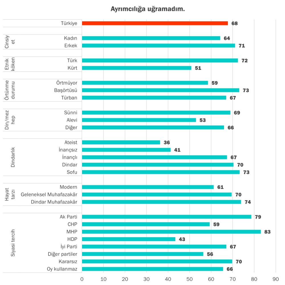 Bölümde, toplumda ayrımcılık, demokrasi ve yargılar, toplumun geçmişle yüzleşme algısı, Kürt sorununun nasıl çözülebileceğine ve Anayasanın temel ilkelerine dair görüşleri inceleniyor: