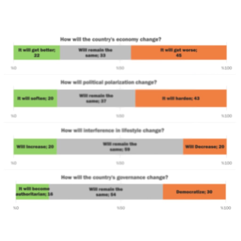 Erdoğan'ın karne notu 0,1 puan düşüş ile önceki ayların seviyesi olan 2,5 puana gerilerken en çok düşüş MHP seçmeninde yaşanmış. Bunun yanında, önümüzdeki seçimi Erdoğan'ın kazanmasına olumsuz bakanlar toplumdaki her 3 kişiden 2'sini oluşturuyor. Oy kullanmayacakların oranındaki artışa rağmen Erdoğan-İmamoğlu arasındaki fark ise hala 10 puan. Erdoğan'ın karne notu, Erdoğan'ın kazanmasına karşı tutumlar, oy kullanmayacakların oranındaki artış, Erdoğan-İmamoğlu senaryosunda her iki liderin de oy kaybetmesi toplumdaki siyasi meşruiyet sorununa ve örgütlenmeyen bir toplumsal muhalefetin varlığına işaret ediyor.