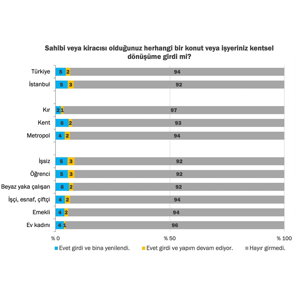 Her ne kadar metropolleşme ve eğitim seviyesinin yükselmesiyle kentsel dönüşümle ilgili politika ve projelerin bilinirliği artsa da İstanbul’daki bilinirlik düzeyi çok daha yüksek. Kentsel dönüşüm çok büyük oranda İstanbul meselesi olarak öne çıkmış, İstanbul’la özdeşleşmiş görünüyor. İstanbul'daki binaların yaşı Türkiye ortalamasından yüksek. Yine İstanbul'da kiracıların oranı Türkiye genelinden yüksek. Muhafazakarlaşma ile ev sahipliği doğru orantılı. Haziran'20'den bu yana kiracıların oranı Türkiye genelinde giderek artmış. Mahallesinde kentsel dönüşüm projesine tabi alanların olduğunu belirtenler Türkiye genelinde yüzde 25'ken İstanbul'da bu oran yüzde 48. Yaşadığı konutun depreme dayanıksız olduğu ortaya çıkarsa devlet desteği olmadan evini yenileyebileceğini düşünenler toplumun yalnızca yüzde 14'ü. Kasım'20'den bu yana binasını depreme karşı kontrol ettirenlerin oranında da artış olduğu görülüyor. Hayat tarzı muhafazakarlaştıkça binasının sağlam olduğunu düşünenlerin oranı artıyor. Türkiye'de depreme hazırlıklı olduğunu düşünenlerin oranı ise yalnızca yüzde 30.