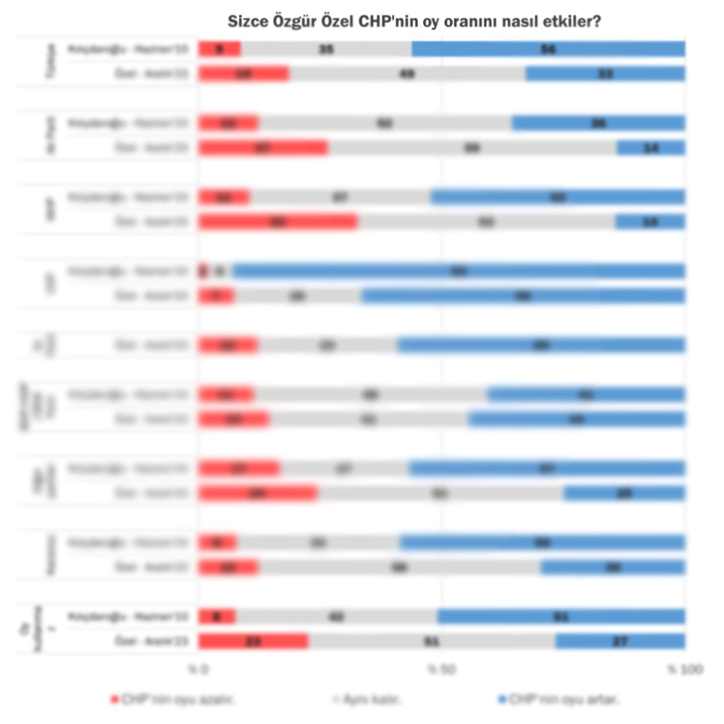 On dört yıllık uzun bir başkanlığın ardından Kemal Kılıçdaroğlu'nun istifasıyla CHP'de başkanlık koltuğuna geçen Özgür Özel'in genel olarak Kılıçdaroğlu Deniz Baykal'ın yerine geçtiğinde oluşandan daha az heyecan yarattığı gözlemleniyor. Toplumun neredeyse 5'te 1'i Özel'i tanımadığını beyan ediyor. Kadınlarda bu oran erkeklere göre çok daha yüksek. Özel'in CHP politikalarına etkisi olumlu olur diyenler olumsuz olur diyenlerden fazla, ancak çoğunluk bir değişiklik olmayacağı görüşünde. Özel'in CHP'nin oy oranına etkisi konusundaki düşüncelerde de örüntü aynı şekilde. Öte yandan, 2010'da Kılıçdaroğlu'nun oy oranını artıracağını düşünenler çoğunluktaydı. Özel'e en yüksek karne notunu ise sosyal demokratlar veriyor.