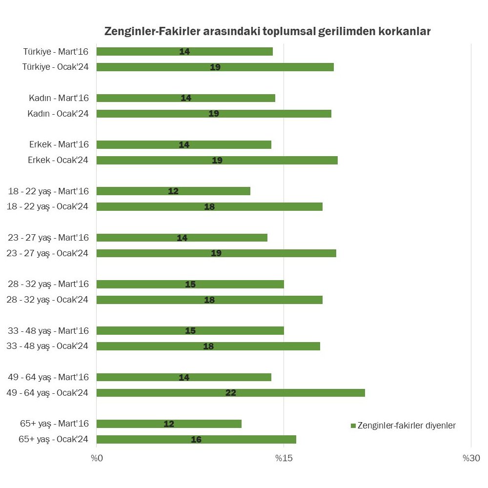 Toplum genelinde en çok korku duyulan toplumsal gerilim Erdoğan yandaşları ve karşıtları arasındaki gerilim oluyor. Türkler ve Kürtler arasındaki gerginlikten korku duyma eğilimi Mart'16 tarihinden bu yana oldukça gerilemiş durumda. Öte yandan, modern-muhafazakar ve dindar-laik gerilimlerinden korku duyma eğilimi artmış. Dindar muhafazakarların en çok korku duyduğu gerilimlerin sıralaması toplum genelindekilerle aynı olsa da Türkiye ortalamasının üzerinde orana sahip olduğu iki gerilim modernler-muhafazakarlar ve zenginler-fakirler arasındakiler. Kürtleri en çok korkutan ise Türkler-Kürtler arasındaki gerilim.