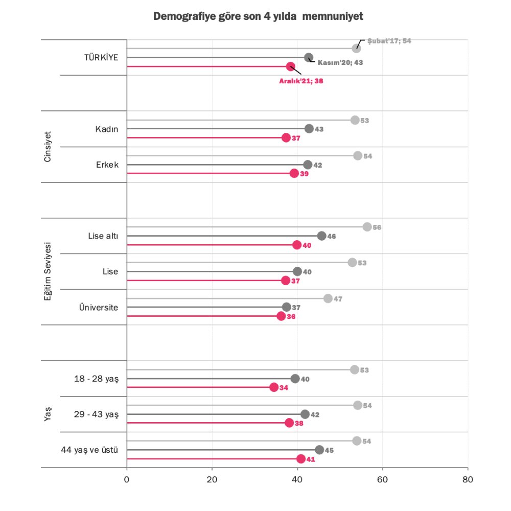 Bölümde, KONDA Barometresi'nin Mart 2010'dan bu yana düzenli olarak ölçtüğü "Memnuniyet Endeksi"nin Aralık 2021 verileri analiz ediliyor. Endeks, bireylerin hem kendi hayatlarına hem de Türkiye'nin genel durumuna dair memnuniyet düzeylerini, 0-100 puan aralığında bir metodoloji ile değerlendiriyor. Çalışma, zaman içindeki memnuniyet eğilimlerini ve farklı alanlardaki (bireysel yaşam, sağlık, ülke koşulları) memnuniyet algılarının nasıl şekillendiğini incelemeyi amaçlıyor:
