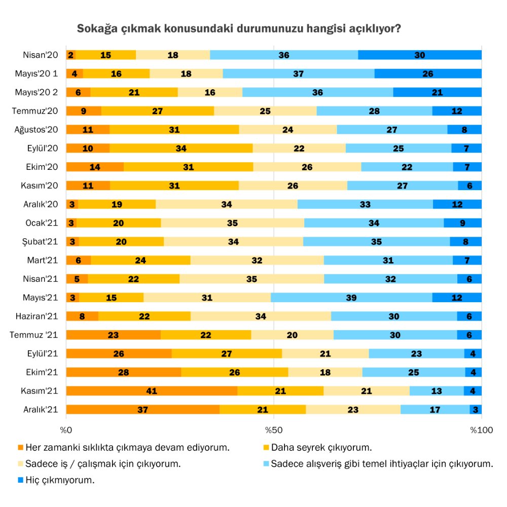 Bölümde, Türkiye toplumunun koronavirüs salgını dönemindeki davranışları inceleniyor. Sokağa çıkma sıklığındaki değişimler, yaş gruplarına ve çalışma durumlarına göre farklılaşan eğilimler ve Omicron varyantının etkileri detaylandırılıyor.