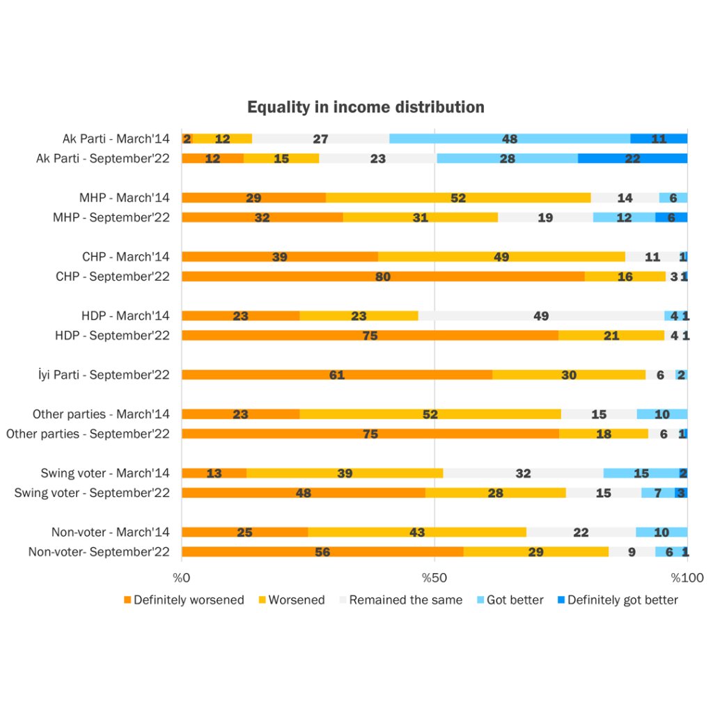 This section evaluates the public's perception of the AK Parti era with regard to road infrastructure, health services, social assistance, environmental policies, education, democratization, economic growth, income distribution, and housing opportunities.Evaluation of the AK Parti EraRoad Construction and RoadsImprovements in the quality of healthcare servic