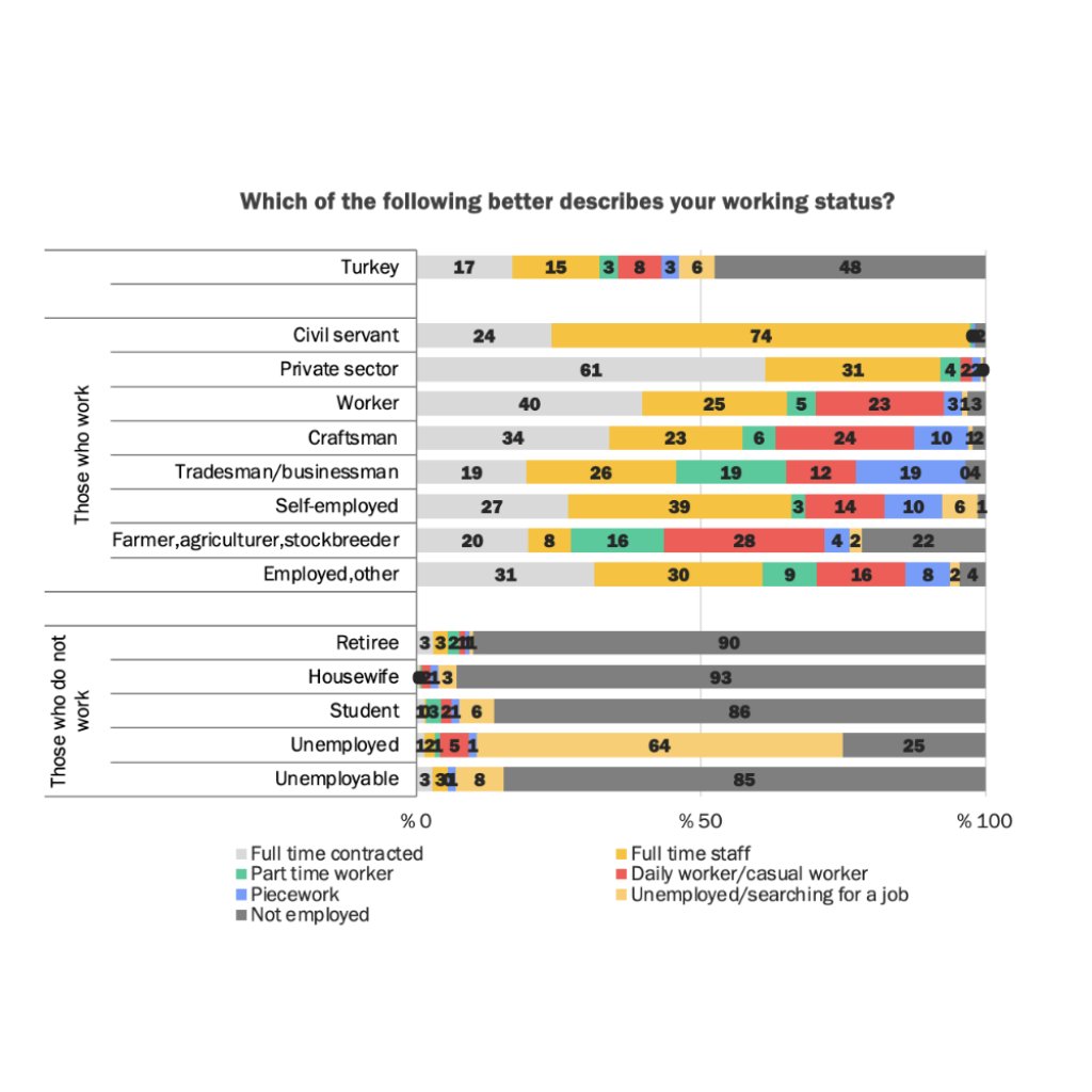 This section consists of questions designed to comprehensively understand participants’ relationship with working life by examining their occupational background, current working conditions, social security coverage, income sources, perceptions of job security, and work experiences during the pandemic. The aim is to analyze both the visible and invisible dimensions of employment in Turkey, prec