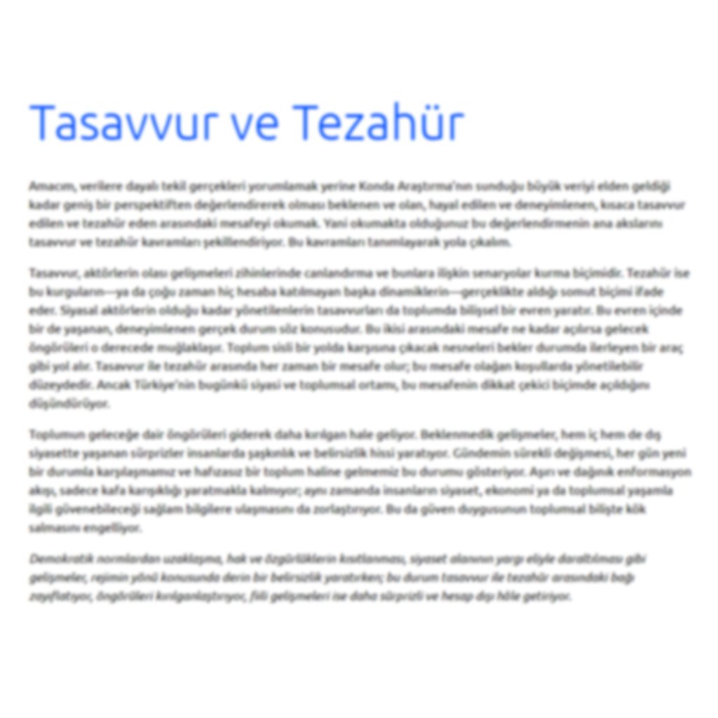 Bu rapor, 2025 yılında Türkiye’de medya, televizyon ve yapay zekâ etrafında şekillenen iletişim pratiklerini, toplumsal ruh hâli ve gündelik hayat deneyimleriyle birlikte ele alıyor. Medyayı yalnızca bilgi aktaran bir alan olarak değil, belirsizliklerle dolu bir dönemde insanların dünyayla kurduğu ilişkinin temel zeminlerinden biri olarak değerlendiriyor. Konda Barometresi verilerinden hareketl