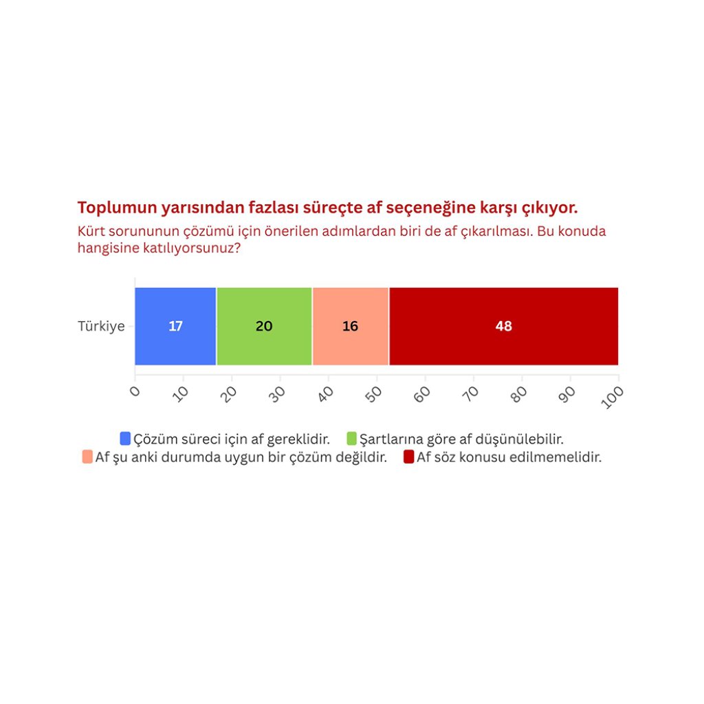 Bu içerik çözüm sürecinin Kürt sorununu çözeceğine yönelik inanç ile Çözüm Süreci Komisyonu ile Abdullah Öcalan arasında yapılan görüşmeye dair tutumların ölçümünü içeriyor:Son aylarda yaşanan gelişmelere baktığınızda sizce, hükümetin başlattığı açılım, Kürt sorununu çözer mi?Çözüm Süreci komisyonunun Abdullah Öcalan'ı ziyaret etmesi kararını nasıl değerlendiriyorsunuz?